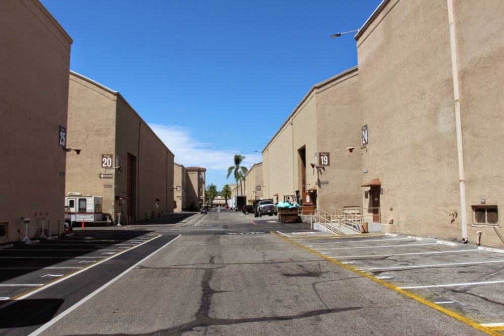 | There are 30 sound stages on the lot, all identically coloured to avoid any spats among the movie star set - this is one 'street' of them |
